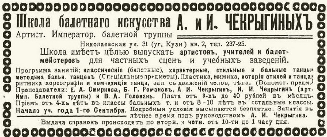 Еженедельный журнал «ТЕАТР И ИСКУССТВО» № 27 от 6 июля 1914 года. Реклама школы балетного искусства А. и И. Чекрыгиных. Школа имеет целью выпускать артистов, учителей и балетмейстеров для частных сцен и учебных заведений.
