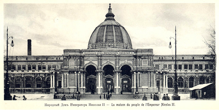 Народный дом императора Николая II – историческое здание в Санкт-Петербурге (Александровский парк, 4) было торжественно освящено 12 декабря 1900 года и получило название «Заведение для народных развлечений императора Николая II». При Народном доме действовали театр, библиотека с читальным залом, столовая, вечерняя школа, лечебница для алкоголиков, кружки для взрослых и детей. Для развлечения детей и взрослых при нём открыли первую в России детскую железную дорогу и американские горки. На фото: центральная часть основного корпуса Народного дома императора Николая II (не сохранилась), начало 1900-х годов.