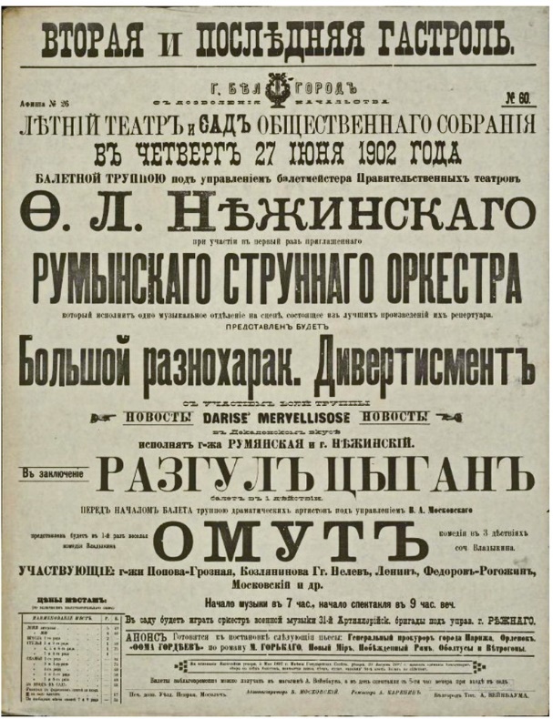 Афиша. Гастроль балетной труппы под управлением балетмейстера Правительственных театров Ф.Л. Нижинского. Дивертисмент исполнять будут г-жа Румянская (по-видимому, опечатка – прим. автора) и г. Нижинский. Летний театр и сад общественного собрания. Город Белгород. 27 июня 1902 года.
