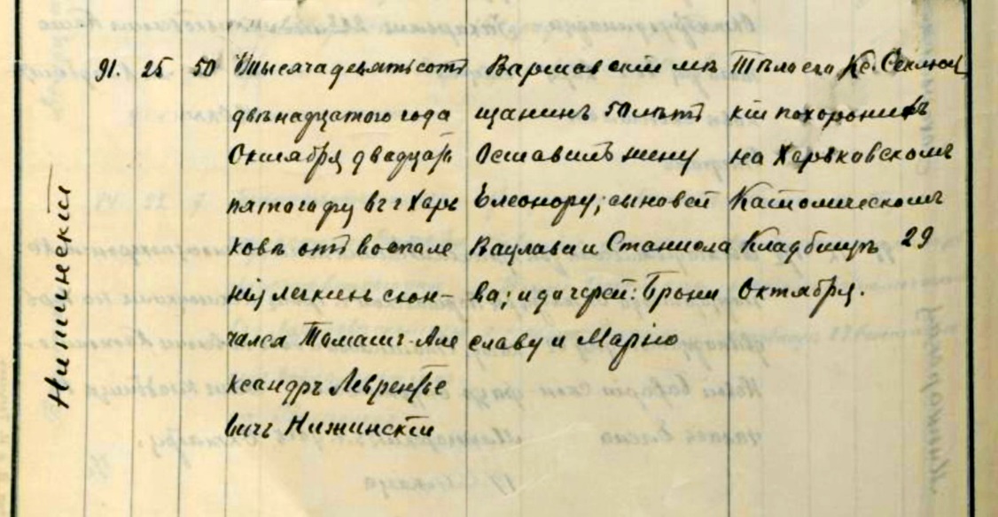 Запись в метрической книге Харьковского римско-католического костёла о смерти Томаша-Александра Лаврентьевича Нижинского в Харькове 25 октября 1912 года от воспаления лёгких. Варшавский мещанин 50 лет. Оставил жену Элеонору; сыновей Вацлава и Станислава; и дочерей: Брониславу и Марию. Похоронен на харьковском Католическом кладбище 29 октября. Копия из личного архива автора. Публикуется впервые. (Источник: ЦГИА СПб. Фонд 2292 Опись 1 Дело 311).