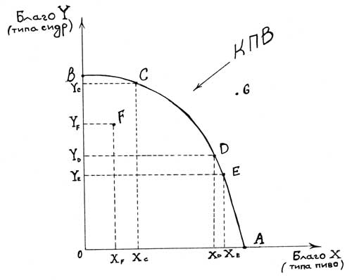 Если мы ткнем в любую точку на этой дуге, то узнаем о том максимальном количестве продукта, который мы можем производить при эффективном использовании ресурсов, которыми обладаем. Давайте представим, что благо Х – это пиво, которое производит завод «Кобылкин», а благо Y – это сидр. Если мы выбираем вариант с точкой В, значит мы производим 900 л сидра в день, а пива производим 0 л, если выбираем точку А, значит производим 1000 л пива в день и 0 л сидра. Все остальные точки на графике – это варианты сочетания пива и сидора, например точка D показывает, что мы можем производить 800 л пива и 100 л сидра в день. Если проведем опрос покупателей и узнаем, что 88 % предпочитают пиво, а 12 % предпочитают сидр, это будет наш оптимальный вариант. Точки внутри графика, например F – указывают нам на неполное использование ресурсов, то есть вместо возможных 1000 л в день, мы делаем только 800 л. Точки вне графика (G) указывают нам на те ресурсы, которыми мы пока не обладаем. Мы хотели бы создавать 1200 л сидора в день, но пока наша техника на это не способна. Чем выше уровень технического прогресса, тем правее расположен график – ближе к точке G.