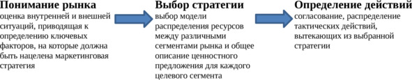 Стратегия маркетинга представляет собой набор стратегических решений относительно выбора целевых сегментов и разработки концепции позиционирования товара (марки) на них, а также их воплощения в подробных программах продвижения, распределения, ценообразования.