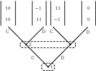 Модель Хардина часто формализуется в виде игры, известной в теории игр как «дилемма заключенного» (ДЗ, см. [Dawes, 1973, 1975])[3] Предположим, мы считаем участниками этой игры владельцев стад, совместно использующих для выпаса общий пастбищный луг. Для этого луга существует верхний предел количества животных, которых можно выпасать на лугу каждый сезон с тем, чтобы к концу сезона они были как следует откормлены. Обозначим это число L. Для игры двух лиц кооперативной стратегией может считаться такое поведение, когда число животных, выгоняемых каждым владельцем на общее пастбище, равно L/2. Стратегия ущерба (потравы выпаса) для каждого владельца стада состоит в том, чтобы выгонять на пастбище такое количество животных, при котором, как он полагает, их продажа в конце сезона принесет ему максимальную прибыль (при заданных затратах, которые он несет в частном порядке); предположительно это количество будет превышать L/2. Если оба владельца ограничат количество животных, выгоняемых каждым из них на пастбище, величиной L/2, они получат 10 единиц прибыли. Если они оба выберут стратегию потравы, то никто из них не получит никакой прибыли вообще. Если один из них ограничит число выпасаемых животных величиной L/2, тогда как другой будет выпасать столько животных, сколько ему захочется, то такой «истощитель» получит 11 единиц прибыли, а владелец, ограничивающий выпас своего стада, получит убыток, или прибыль, в размере –1. Если каждый будет выбирать независимо один от другого и не будет иметь возможности заключить с другой стороной обязательственный контракт, то они оба выберут стратегию доминирования, которая приведет к потраве пастбища. Если каждый осуществит потраву пастбища, то и тот и другой получит нулевую прибыль. Назовем эту игру игрой стада по Хардину, или игрой 1. Ее структура совпадает с игрой «Дилемма заключенного»[4].