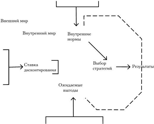 Таким образом, я пользуюсь не узкой, а наоборот, очень широкой концепцией рационального поведения. Внутренняя структура индивидуального выбора, из которой я исхожу в настоящем исследовании, изображена на рис. 2.1. Выбор индивидом его стратегии определяют четыре переменные – ожидаемые выгоды, ожидаемые затраты, внутренние нормы и ставки дисконтирования. Выбирая стратегии, индивиды совместно производят результаты, которые, будучи элементом внешнего мира, сталкиваются с будущими ожиданиями выгод и затрат, связанных с действиями. Внутренние нормы, которыми располагает индивид, зависят от норм поведения в тех или иных ситуациях, разделяемых другими людьми. Аналогично на внутренние ставки дисконтирования влияет множество возможностей, имеющихся у индивида вне рамок любой конкретной ситуации.