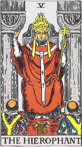 Общее значение: зачастую эта карта ассоциируется с браком, клятвами и венчанием. Такой союз будет основан на духовном развитии обоих партнеров. Также иерофант показывает наличие покровителя, наставника или духовного учителя. В окружении благоприятных карт означает “Брак, заключенный на небесах”.