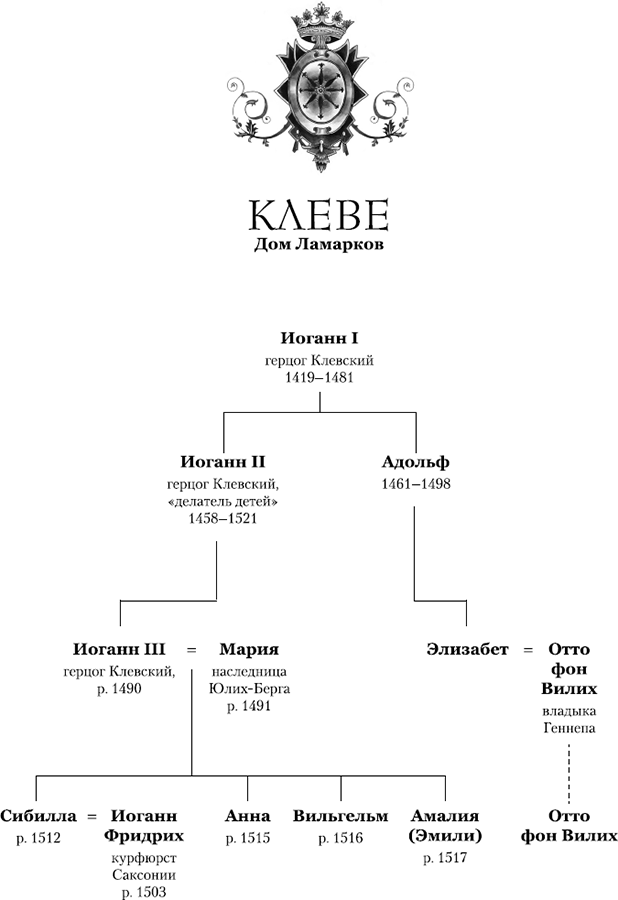 Каждое лето отец, известный подданным как герцог Иоганн III, перебирался с женой и детьми сюда, в Шваненбург – огромный дворец, построенный на крутом каменистом холме, который возвышался над могучим Рейном и славным городом Клеве. Сегодня к ним ненадолго приехали погостить дядя Отто фон Вилих, добродушный владыка Геннепа, и тетя Элизабет, никому не позволявшая забывать, что она дочь герцога Иоганна I. Они наверняка везли с собой Отто, дядиного побочного сына. Хотя двор Клеве имел репутацию места, где строго блюдут правила морали, бастардам здесь не отказывали в милостях. Дед Анны со стороны матери, герцог Иоганн II, имел тридцать шесть незаконнорожденных детей; не зря его прозвали «делатель детей». Умер он, когда Анне было шесть лет, так что помнила она его весьма смутно, тем не менее живые подтверждения дедовской необузданной плодовитости встречались ей при дворе и в домах клевской знати на каждом шагу. Казалось, она в родстве почти со всеми в находившихся под властью отца объединенных герцогствах и графствах Клеве, Марк, Юлих, Берг, Равенсберг, Зютфен и Равенштайн.