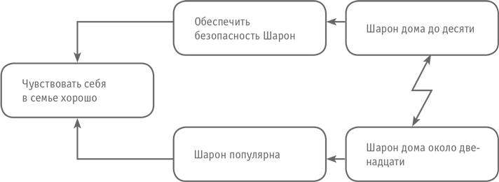 Инструкций я не нахожу, да они и не нужны: я и так помню. Беру бумагу и ручку и начинаю строить диаграмму разрешения конфликтов «грозовая туча». Первый вопрос: чего хочу я? В правом верхнем углу пишу «Шарон дома до десяти». Внизу под этим записываю ответ на вопрос «Чего хочет Шарон?» – «Шарон дома около двенадцати». Ни за что!