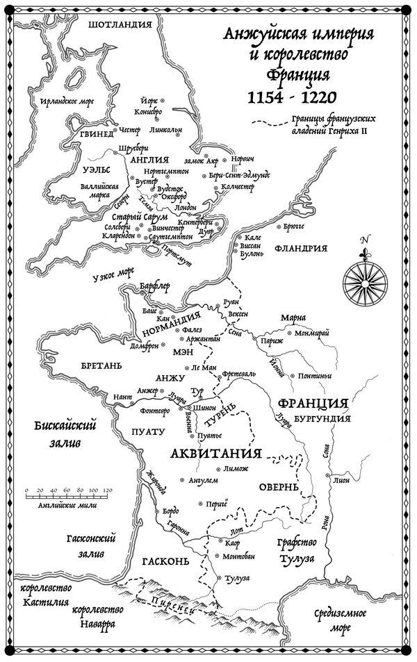 Генрих уверенно держал в руках инкрустированную драгоценными камнями державу и меч суверена. Его губы сжались в твердую, прямую линию, а серые глаза смотрели целеустремленно. В смешении мрака и света его борода сверкала медно-рыжим, он излучал жизненную энергию и пыл, как и полагается юноше двадцати одного года от роду. Он уже носил титулы герцога Нормандии, графа Анжу и герцога-консорта Аквитании и еще с тех пор, как в четырнадцать лет возглавил свой первый военный поход, был тем, с кем нужно считаться.