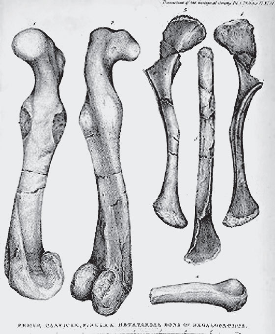 Рис. 1.5. Бедренная кость, ключица, малоберцовая кость и плюсневые кости мегалозавра (Buckland, 1824, plate XLIV; иллюстрации Мэри Морленд Бакленд)