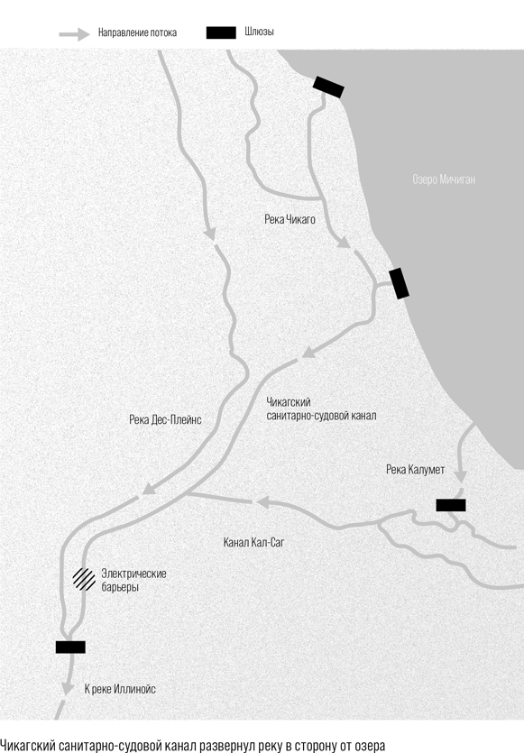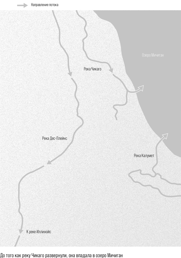 Канал, который спроектировали в конце XIX в. и ввели в эксплуатацию в начале XX в., буквально повернул реку вспять. Она изменила направление течения, а городские отходы перестали попадать в озеро Мичиган и потекли в другую сторону, в реку Дес-Плейнс, а оттуда в Иллинойс, Миссисипи и, в конечном итоге, в Мексиканский залив. «Вода в реке Чикаго теперь похожа на жидкость», – гласил заголовок в The New York Times[6].
