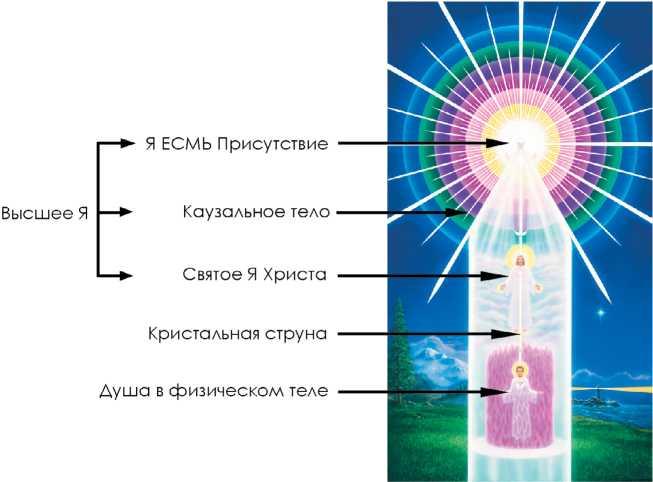 Душа представлена нижней фигурой на схеме. Как же эта душа, которая сейчас обитает в плотном физическом теле, соединяется с бескрайней кладовой духовного света своего каузального тела? Свет сходит к душе по так называемой кристальной, или серебряной, струне, которая на схеме показана в виде тонкой белой линии. Струну, которая исходит от Бога Отца-Матери из Великого Центрального Солнца, можно сравнить с пуповиной, которая соединяет младенца в утробе с его матерью. Это – «спасательный трос», связывающий нас с Духом. Божественная энергия течёт от Бога Отца-Матери по кристальной струне к Я ЕСМЬ Присутствию и затем продолжает свой путь к душе, пребывающей в физическом теле. Прежде чем эта энергия достигнет души, она проходит через другую часть нашего сознания, которая называется «Святое Я Христа» и представлена на Схеме средней фигурой.