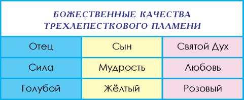 Итак, какое значение для индивидуума имеет истинная природа этого духовного пламени? Оттачивая Божественные качества трёхлепесткового пламени, человек может проявлять Троицу сознания Бога и ощущать рост своего мастерства во всём, что бы он ни делал. И вот почему. Розовый лепесток – пламя творчества – рождён из любви, сострадания и милости Святого Духа, который может наделить этим Духом всё творение. Жёлтый с золотом лепесток представляет Сына мудрости, разум Христа внутри, который наделяет различающим разумом. А голубой лепесток содержит силу и решимость Отца, что позволяет проявиться Божественной светокопии души.