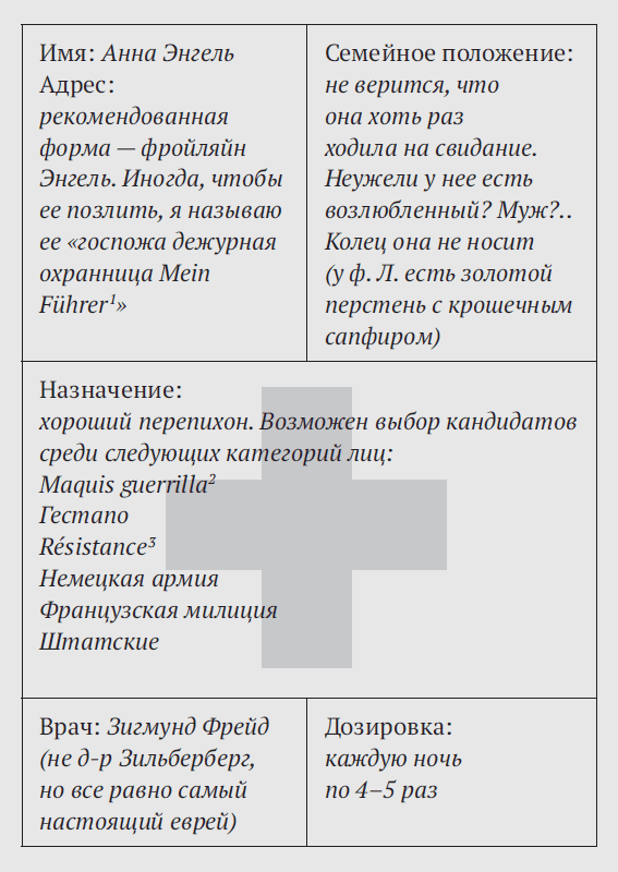 Я уже и так, сама того не ведая, устроила ей неприятности, когда написала о ее сигаретах. Когда Энгель на дежурстве, курение под запретом. Похоже, Адольф Гитлер объявил табаку вендетту, находя его гадким и отвратительным, и потому военным полицаям с приспешниками нельзя дымить на работе. Но вряд ли условие так уж строго соблюдается, если не считать тех учреждений, которыми руководит столь одержимый солдафон, как Амадей фон Линден. На самом деле, стыд ему за это и позор, ведь горящая сигарета – очень полезный инструмент, если твоя работа заключается в том, чтобы добывать информацию из агентов вражеской разведки.