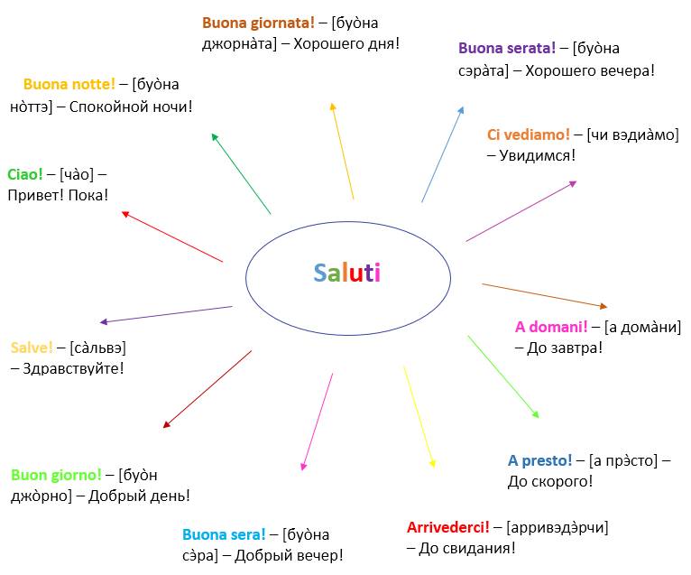 При прощании итальянцы говорят: «A presto!», «Ci vediamo!», «A domani!», «Arrivederci!» или желают – «Buona giornata!» или «Buona serata!». Обязательно порадуйте итальянцев уходя из магазина или ресторана, пожелав им «Хорошего дня/вечера!». А еще можете пожелать им «Хорошей работы!» – «Buon lavoro!» [буо̀н лаво̀ро], они это очень любят.