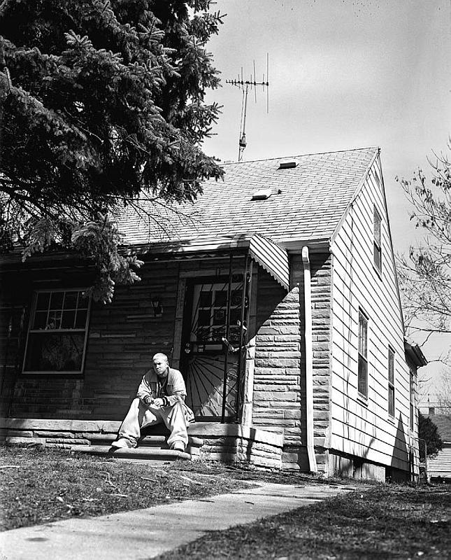 Eminem на ступеньках своего дома в Детройте. Эта фотография была сделана случайно. Певец ехал вместе с друзьями, когда машина вдруг свернула на знакомую улицу. Рэпер решил показать друзьям дом, в котором вырос, и неожиданно родилась идея снять Маршалла на ступеньках. Впоследствии фотография стала обложкой альбома «The Marshall Mathers LP»
