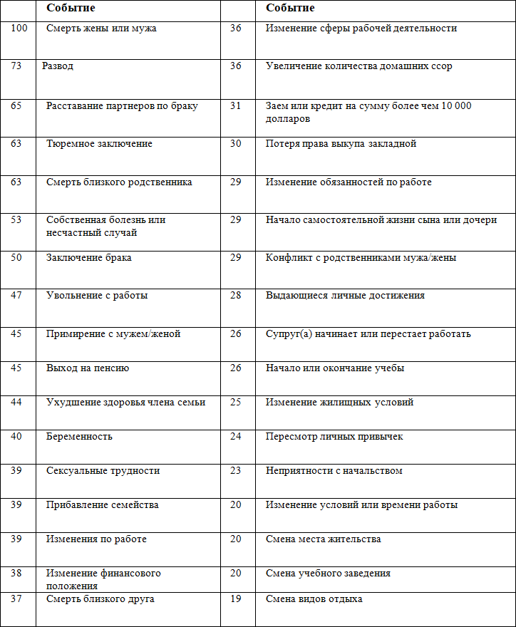 Для того чтобы наглядно показать, как различные события влияют на человека, ученые создали шкалу стресса. В таблице, приведенной ниже, отмечены наиболее важные жизненные ситуации, которым соответствует определенные числа. События, наиболее сильно влияющие на человека, имеют большое цифровое значение – от 70 до 100. Например, такое событие, как смерть мужа или жены, имеет индекс 100. Небольшие жизненные изменения, например отпуск или неприятности на работе, также вызывают стресс, но более слабый – он обозначен небольшим числом (до 30).