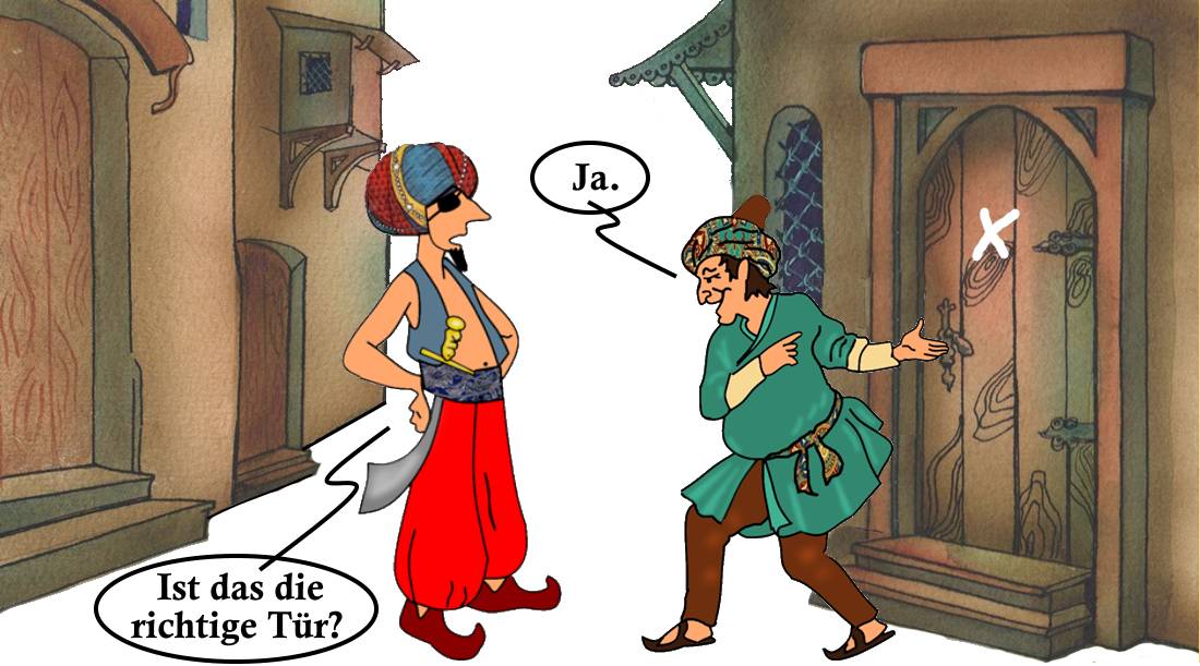 9. Hauptmann: “Ist das die richtige Tür, Hassan?“ Räuber: „Ja.“ Hauptmann: “Bist du sicher?” Räuber: “Klar bin ich sicher.“ Hauptmann: „Was, wenn du dich irrst und Alibaba wohnt woanders?“ Räuber: „Ein Irrtum ist ausgeschlossen.“