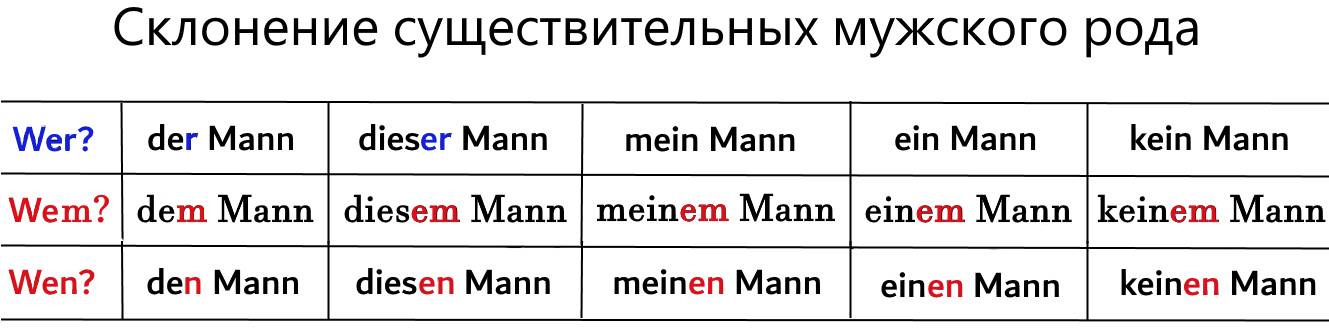 Дательный падеж существительного отвечает на вопрос wem? («кому?»). У существительных мужского и среднего рода окончание определенного артикля в дательном падеже совпадает с окончанием вопросительного местоимения. Сравните: