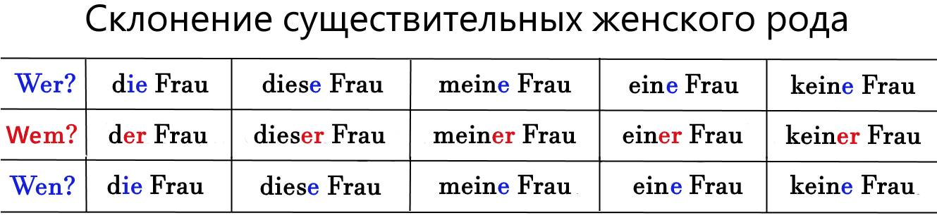 В женском роде мы видим несколько иную картину. Здесь определенный артикль принимает форму der:
