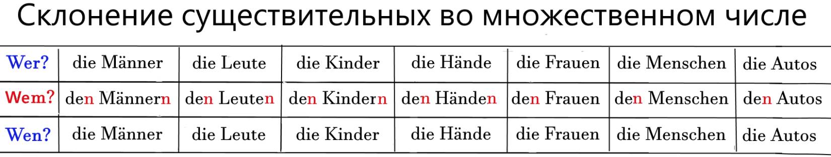 Во множественном числе определенный артикль принимает форму den вне зависимости от рода существительного. Но это не единственное, на что следует обратить внимание. В дательном падеже у существительных во множественном числе появляется падежное окончание. К своей исходной форме они добавляют окончание -n, например: