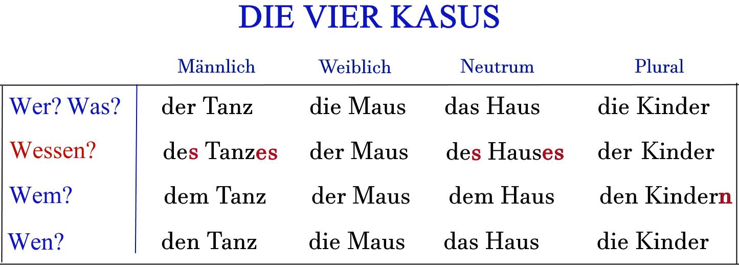 В отличие от других падежей, в генитиве на род существительного указывает не только артикль, но также падежное окончание, которое у существительных мужского и среднего рода дублирует окончание артикля. На существительные женского рода и существительные, стоящие во множественном числе, эта особенность, правда, не распространяется. Они не принимают никаких падежных окончаний. Меняется только артикль, который в родительном падеже принимает форму der.