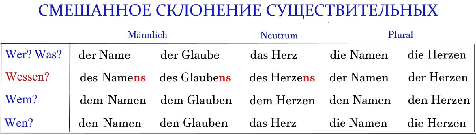 Еще одно исключение представляют собой существительные, принадлежащие к так называемому смешанному склонению. Эти существительные имеют в родительном падеже окончание -ns, то есть фактически совмещают в одном слове слабое и сильное окончание. К смешанному склонению относятся существительные мужского рода der Name, der Gedanke, der Glaube (вера), der Wille (воля), der Buchstabe (буква) и еще несколько, и существительное среднего рода das Herz.