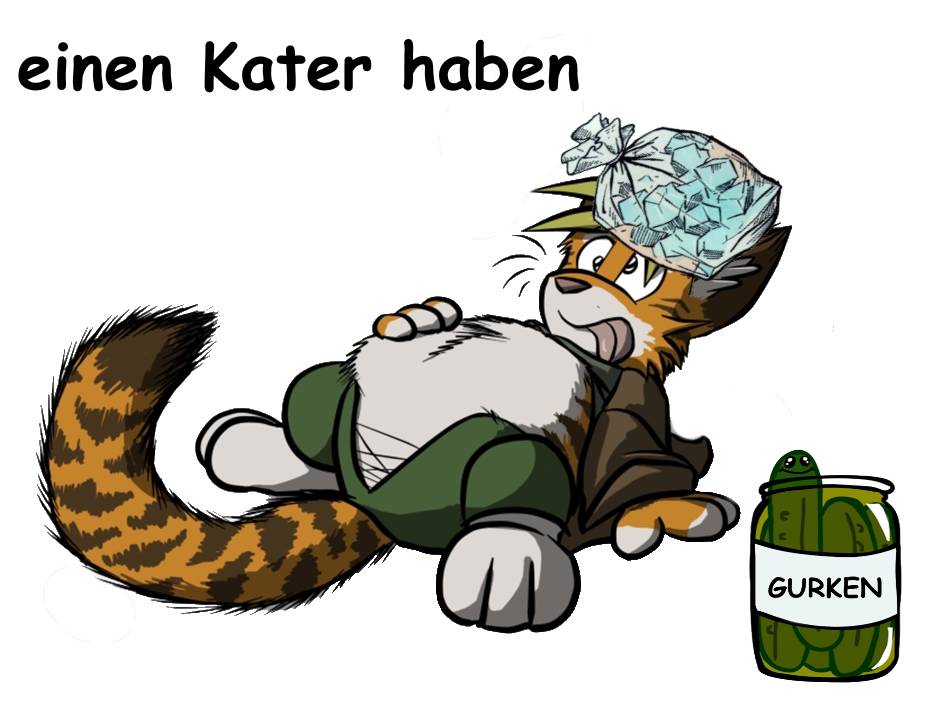 «Иметь кота» значит быть с похмелья. Der Kater («кот») – это также «похмелье», тяжелая голова с похмелья. Например: “Ich habe einen schrecklichen Kater.” – «У меня голова раскалывается с похмелья».