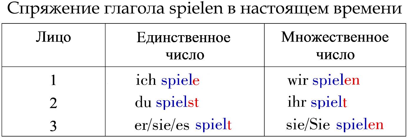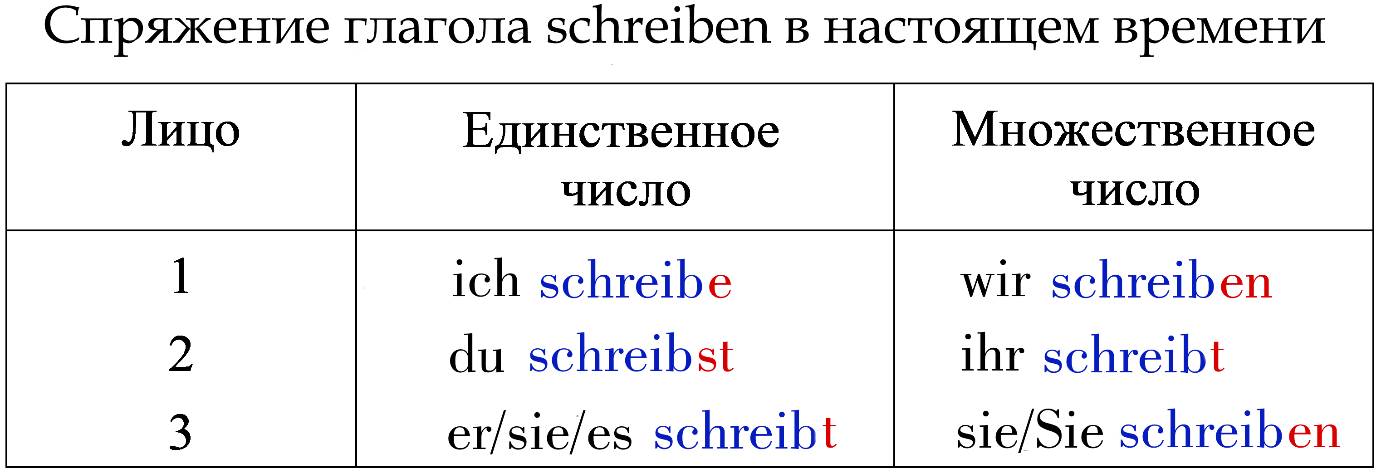 К сожалению, того же нельзя сказать об остальных личных формах, каждая из которых имеет свое собственное окончание. Эти окончания присоединяются к основе глагола (в таблице она выделена синим цветом) и выглядят следующим образом: