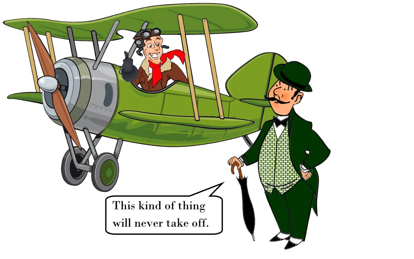 Ключ. Он сомневается в том, что этот странный аппарат сможет подняться в воздух. Здесь фразовый глагол take off употребляется в значении «взлететь», а именно оторваться от поверхности. “Please sit down. The plane is about to take off.” – «Пожалуйста, сядьте. Самолет сейчас взлетит», – говорит стюардесса замешкавшемуся пассажиру. До этого самолет был on the ground – на земле.