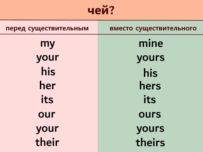 1. «Какой чудный (marvelous) дом! Он твой?» – «Был мой, теперь он наш». 2. «Это мой кошелек (purse)! Вы его у меня украли!» – «Верно. Я его у вас украл, так что (so) теперь он мой». 3. «Это мой чемодан, и я хочу получить его обратно (I want it back)!» – «Поправочка (correction), мадам. Это был ваш чемодан, теперь он мой». 4. «Это было твое решение, не мое!» – «Поправочка: это было наше решение». 5. Не вини себя. Это была моя вина, не твоя. 6. «Чья это подпись? (Whose signature is this?)» – «Твоя. Чья же еще? (Who else’s [´elsiz]?)» 7. «Простите, сэр. Вы уверены, что это ваш зонт?» – «Чей же еще зонт это может быть? (Who else’s umbrella could it be?)» – «Мой». 8. «Чья это кровь на твоей рубашке?» – «Что за глупый вопрос? (What kind of question is that?) Моя, разумеется. Чья еще кровь это может быть?» 9. «Чья это подпись?» – «Она может быть чьей угодно. Это всего лишь крестик». 10. «Лукас мой сын?» – «Я никогда не говорила, что он твой». – «Кто его отец?» – «Не твое дело. (That’s no business of yours.)» – «Я имею право знать. (I have every right to know.)» – «Он мой и только мой». 11. «Который из этих [гостиничных] номеров ее?» – «Кажется, номер 345». 12. «Который из этих детей ваш, сэр?» – «Хм. Непростой вопрос. (That’s a hard one.)» 13. «Мы могли бы подсыпать что-нибудь в его вино (doctor his wine). Который из этих бокалов (glass) его?» – «Хм. Непростой вопрос». 14. «Все дома на этой улице выглядят одинаково. Откуда ты знаешь, что этот дом его?» – «Я пометила его крестиком (with a cross)». 15. «Кто еще знает об этом?» – «Больше никто. Это мой секрет и твой, больше ничей». 16. Наши проблемы ничто по сравнению с (compared to) их [проблемами]. 17. Наши долги ничто по сравнению с их [долгами]». 18. Мои раны ничто по сравнению с теми, что получил он.