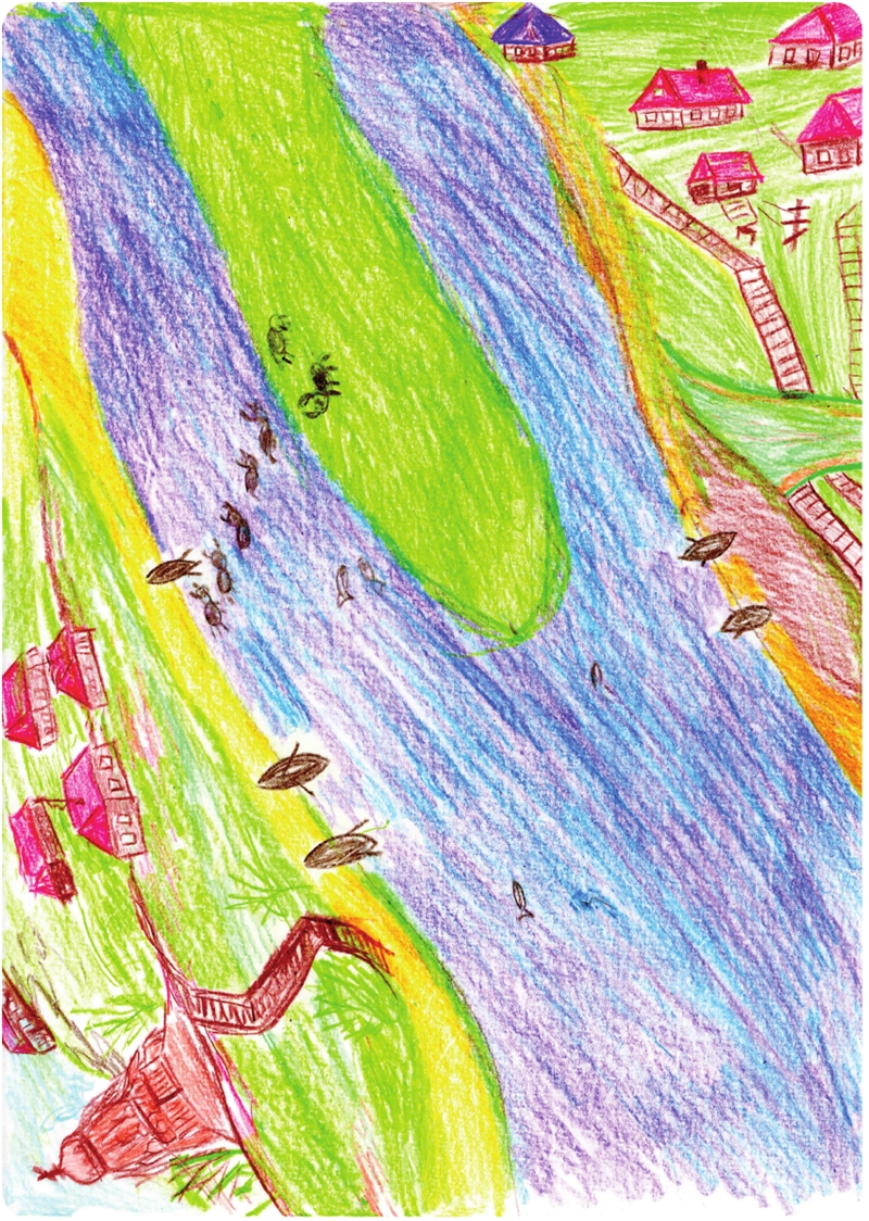 – Это Кузомень, старое село в восемнадцати километрах от села Варзуга, где ты родился. У нас тут много песка, потому что давным-давно все деревья выкопали и с моря нанесло песок. Сейчас деревья сажают, чтоб задержать песок. А мы лошади, которые гуляют сами по себе. Мы тут всех знаем, и нам все рады, – ответила самая большая лошадь.
