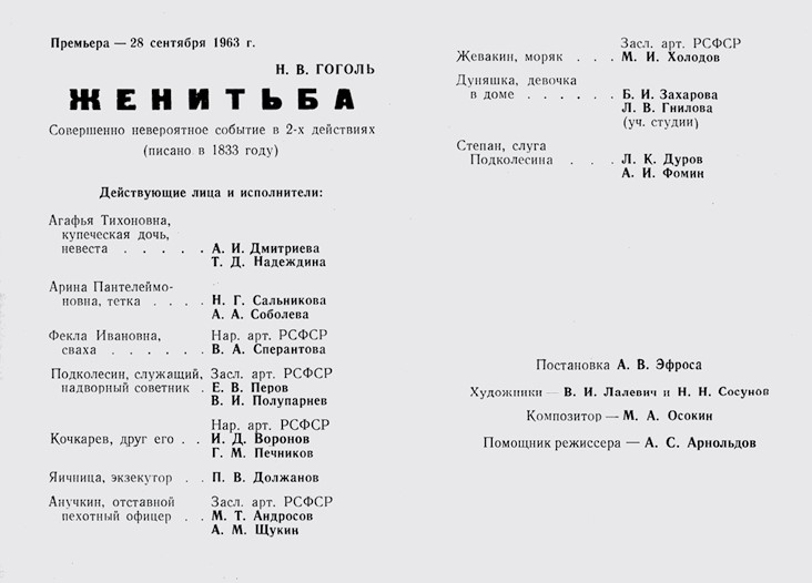 Для начала вспомним, что Эфрос уже обращался к «Женитьбе» в 1963 году, будучи режиссером Центрального детского театра. Интересно, что отклики о том спектакле невероятно противоречивы. Хочется привести здесь связанный со спектаклем случай, описанный Эфросом в «Книге четвертой».