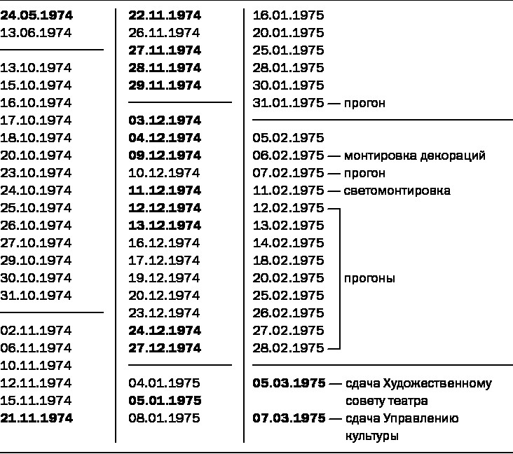 График репетиций 27Перед нами – график репетиций спектакля «Женитьба». Выделены даты тех репетиций, записи которых приведены в книге. В главе также публикуется акт приема спектакля Главным управлением культуры Исполкома Моссовета и протокол обсуждения постановки Художественным советом театра.