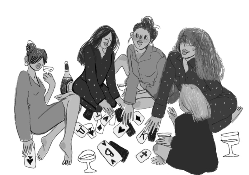 Довольные, переодетые в новые именные шёлковые пижамы, девушки разбирают свои бокалы с шампанским и занимают места в гостиной, разбиваясь на маленькие группы. Люба дожидается, когда все рассядутся, и начинает «модерацию» вечера.