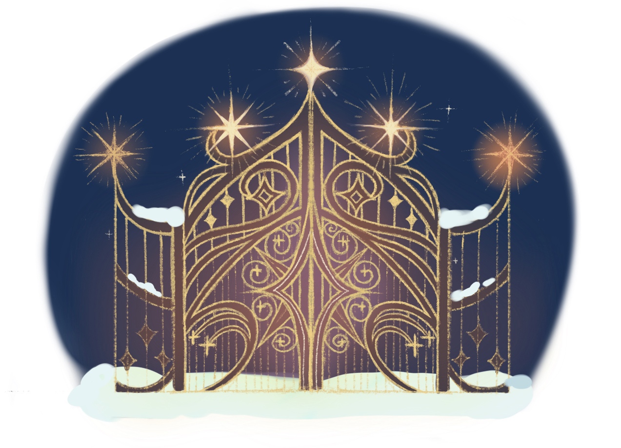 Идти пришлось совсем не долго. Лиза вдруг заметила, что деревья стали расступаться перед ней, а из темноты показались очертания высоких ворот. Верхушку каждой створки украшали самые настоящие звёзды, как те, что сияют на небе. Их свет заливал золотом ворота. Створки стали медленно открываться. Вдруг перед девочкой появился гном. Точно такой же, как на картинках книг: маленького роста, в красных башмачках с загнутыми вверх носами, на кончике каждого мыска висел колокольчик, который тихо звенел при ходьбе. Завершали образ зелёная сюртук и такого же цвета колпак с белым помпоном.