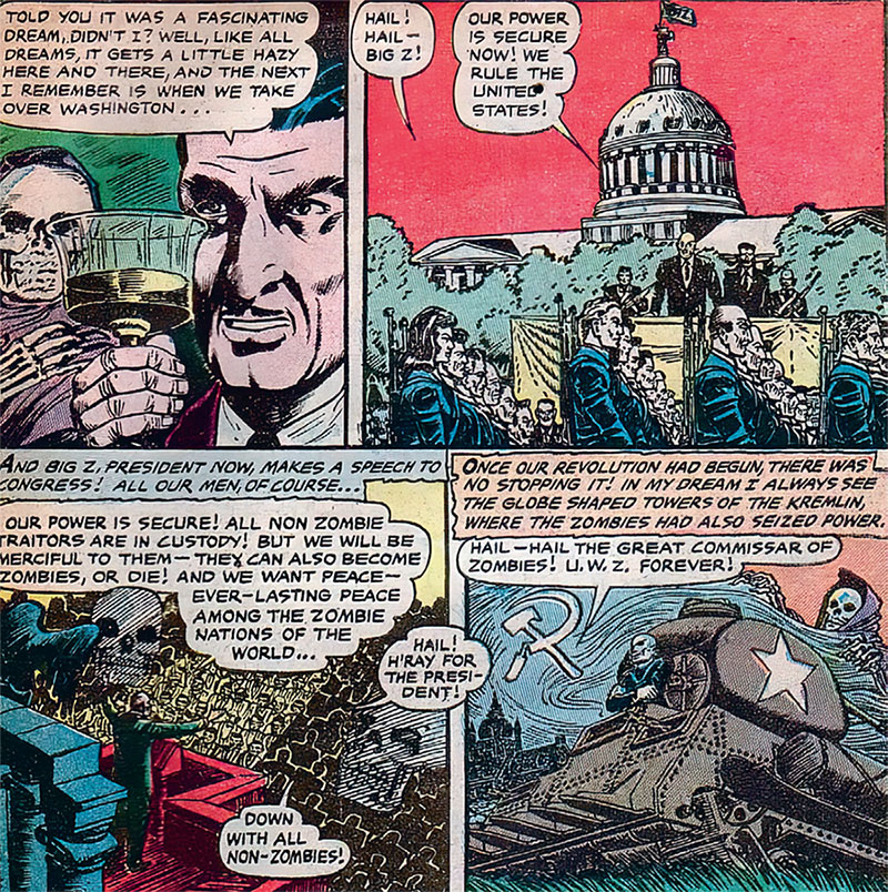 Так, в комиксе «Мертвецы: от берега до берега», опубликованном в 1954 году, рассказывается история того, как в результате забастовки могильщиков западную цивилизацию сокрушает орда коммунистических зомби под руководством своего восставшего из мертвых Верховного Комиссара. Несмотря на очевидный лейтмотив холодной войны, сегодняшние ретроспективные литературные исследования утверждают, что комикс оказал большое влияние на последующее движение за гражданские права в Америке. В комиксе подчеркивается важность опыта ветеранов, ставится под сомнение вера в науку и промышленность, а также женщины признаются жертвами войны.