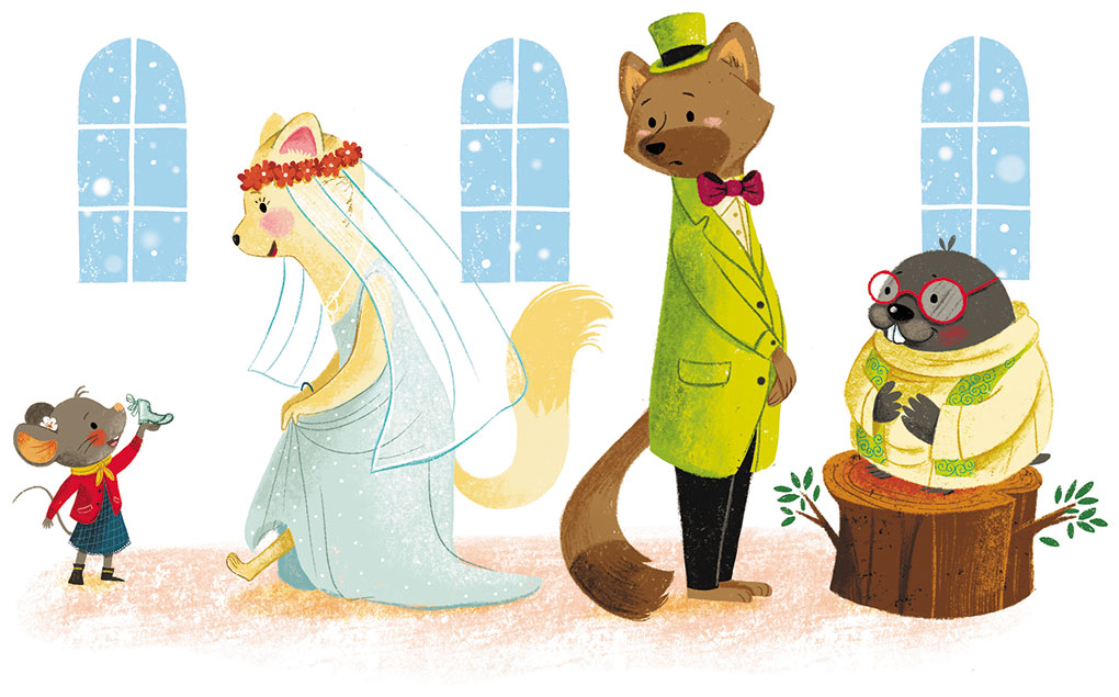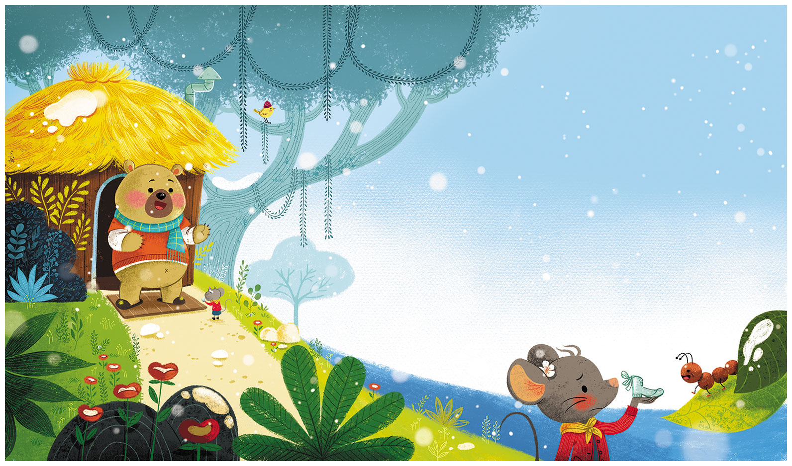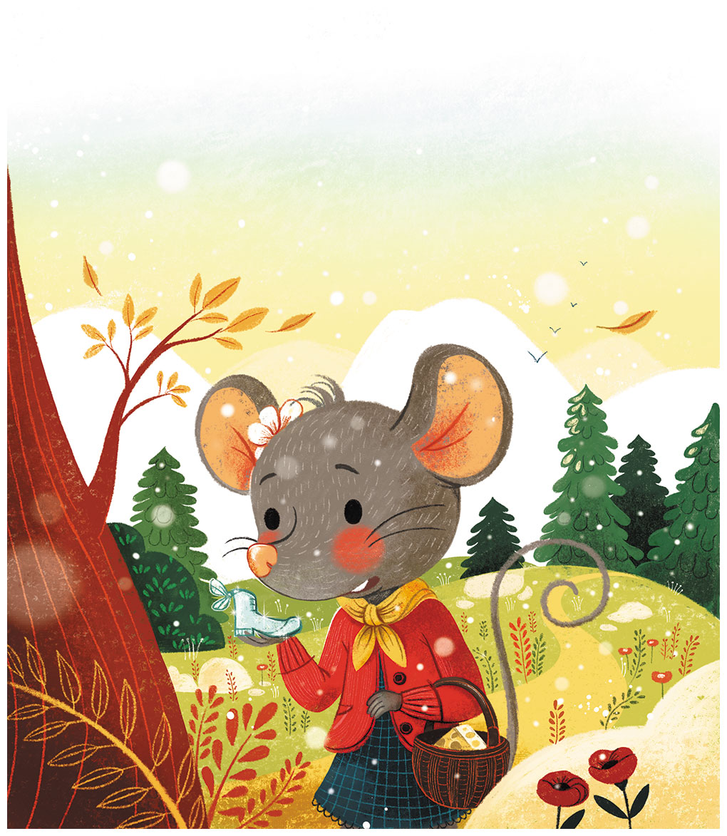 Мышка вежливо кланяется, готовая удалиться. В её животе булькает всё громче, а голова начинает кружиться. После долгого блуждания по холоду Флавия умирает от голода, а тут ещё и корзинка потерялась!
