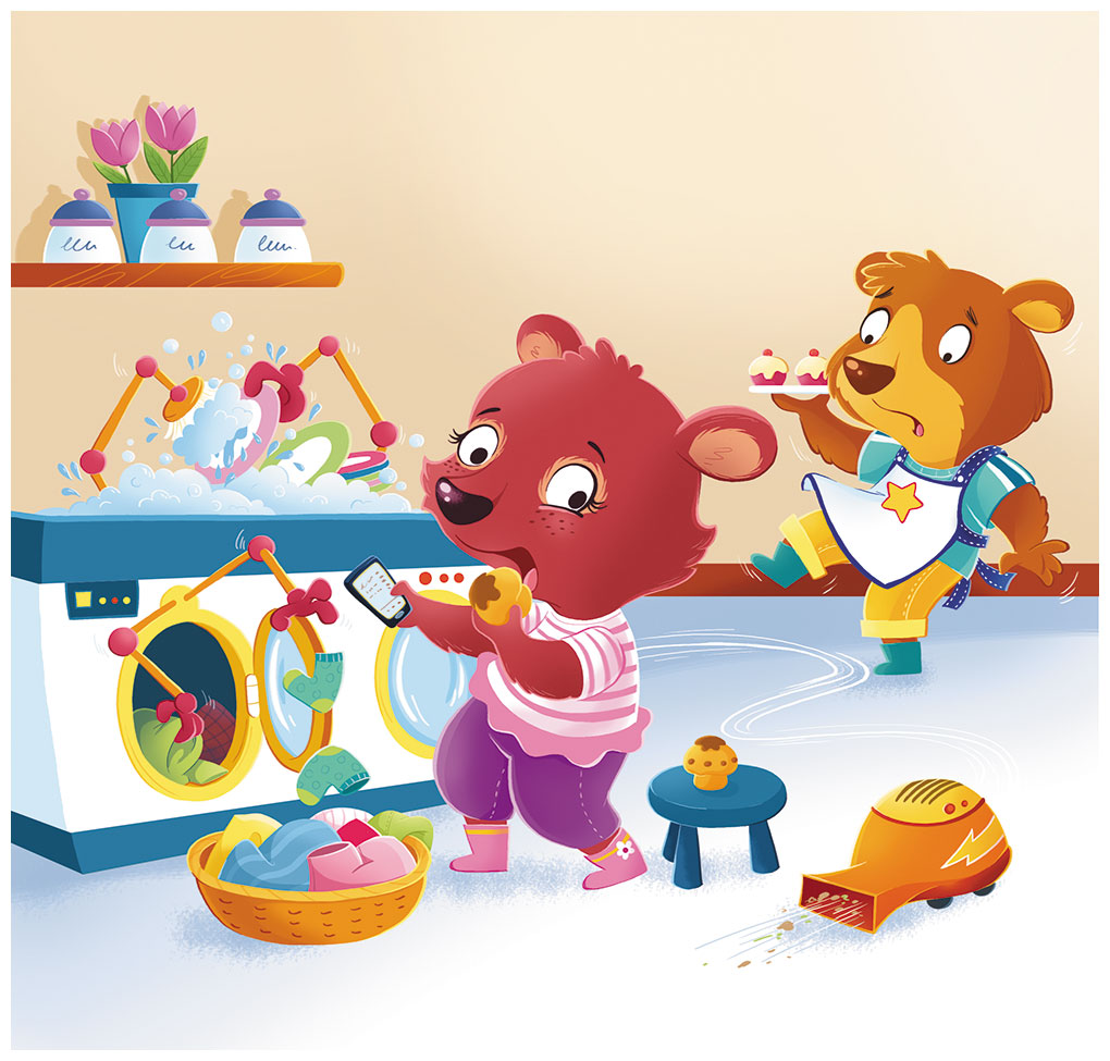 Чтобы облегчить себе жизнь, госпожа Медведица накупила множество фантастических приспособлений: стиральную машину, посудомойку, сушилку и даже пылесос, который подключается к телефону!