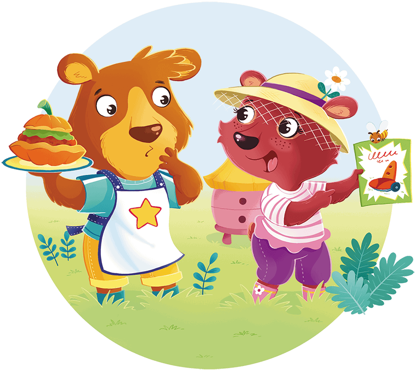 А есть ещё господин Нуга, который приходит в гости, надевает красивый фартук и готовит прекрасные блюда. В спешке госпожа Медведица съедает их слишком быстро.