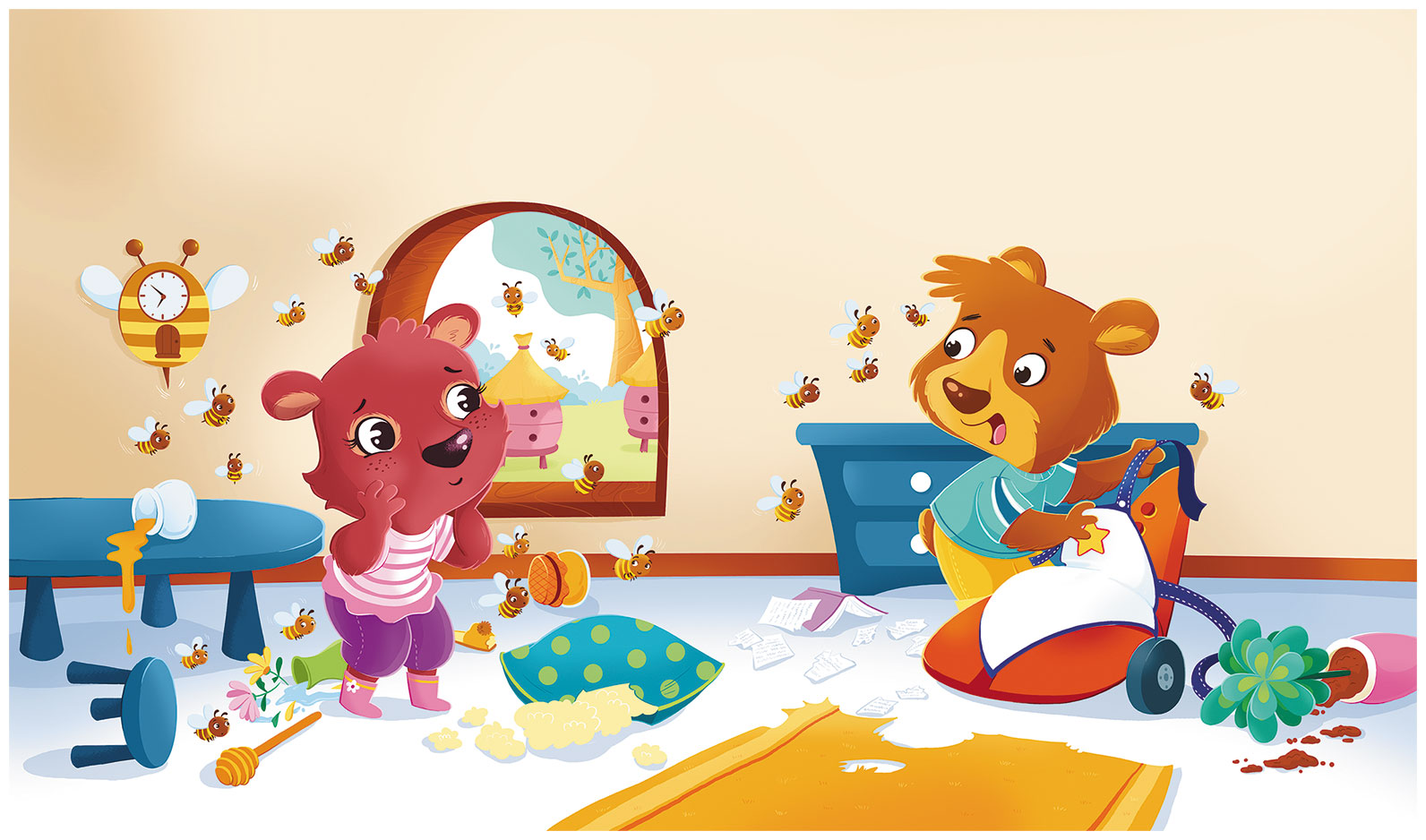 За роботом бежит госпожа Медведица, а её преследует рой разъярённых пчёл. Всё в доме перевёрнуто вверх дном.