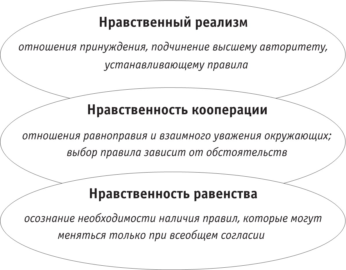 • три уровня нравственного мышления: донравственный (предконвенциональный), конвенциональной нравственности, автономной нравственности (постконвенциональный);