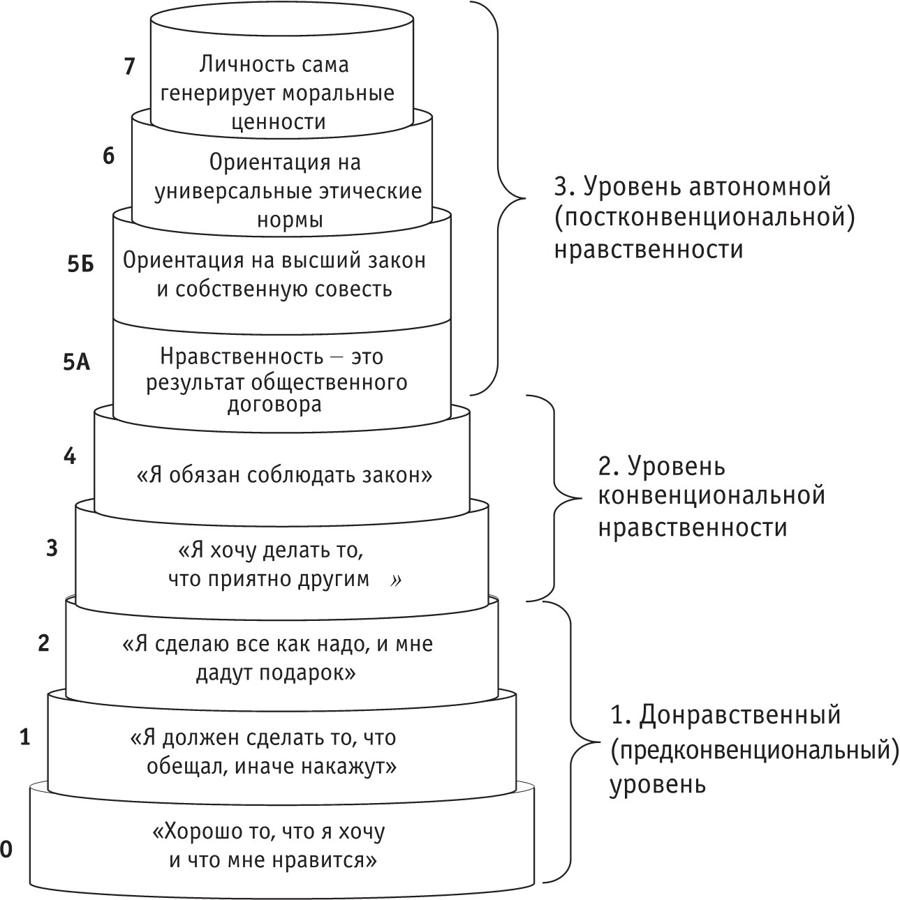 – стадию 7 – вершину уровня, – где моральные ценности обретают философский смысл и человек сам может генерировать их. Однако, по признанию самого Л. Кольберга, на эту стадию поднимаются немногие личности, т. е. данная стадия является нетипичной и не имеет всеобщего характера.