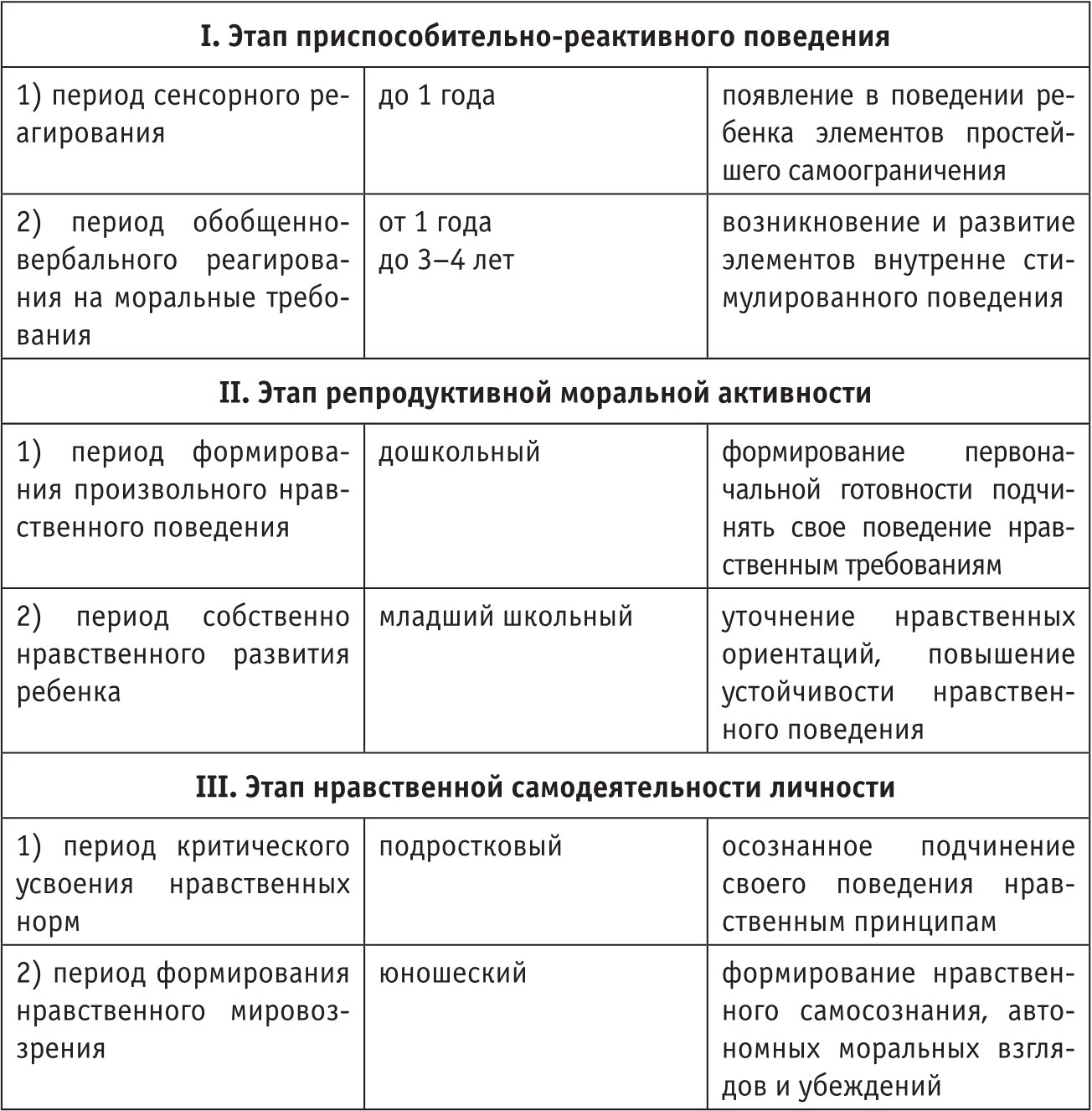 С его точки зрения, весь процесс нравственного развития ребенка делится на три этапа, каждый из которых, в свою очередь, имеет по два качественно своеобразных периода.