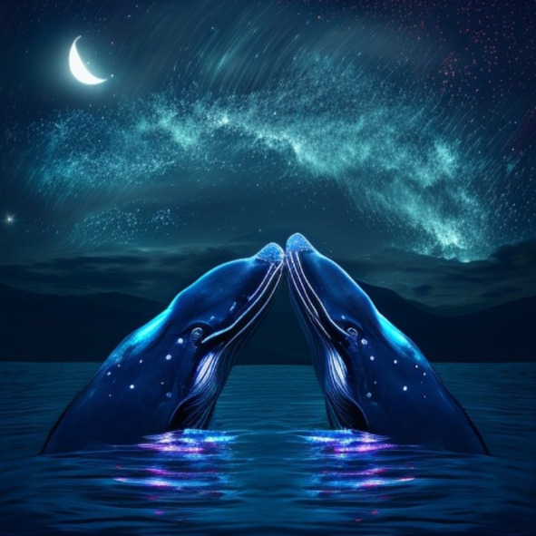 Кит долго плыл один в огромном океанеМиры менялись между солнцем и лунойПод ярким звездопадом загадал желаньеНайти любимую со светлою душойОн сотни раз искал ее во мгле пещерХолодных и пугающе опасныхИ проплывая мимо парусных галерНе мог найти он глаз ее прекрасныхОн встретил ее в теплом океанеКогда садилось солнце над водойГде наполнялись паруса попутными ветрамиИ удивительной природы красотойУслышал нежное пение ее душиМелодию свою в нем узнаваяИ вслушиваясь замер он в тишиТепло текущее по венам ощущаяИ осторожно ближе подплываяОн ей напел мелодию своюИх пение по нотам совпадаяБезмерным счастьем заполняло пустоту