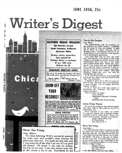 Это фотография страницы из июньского номера «Райтерс дайджест» за 1956 год. Тогда я ее не видел. Мне ее прислал всего несколько месяцев назад, в сентябре 2000 года, один знакомый член Гильдии американских писателей. Случайный знакомый, по доброте своей решивший, что мне этот номер – часть толстенной подшивки, от которой он собрался избавиться – вдруг да и пригодится. Поэтому, спустя сорок с лишним лет эта вещь, наконец, засветилась на моем радаре. Посмотрите на нее.