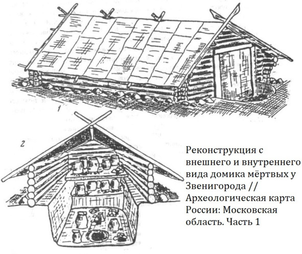 На территории Московской области исследовано лишь одно такое погребальное сооружение у Саввино-Сторожевского монастыря в городе Звенигород Одинцовского городского округа, это небольшая прямоугольная полуземлянка из сруба высотой около двух метров, с двускатной крышей, стены с наружи обложены камнями, внутри полка (или ступенька), на которой размещались остатки трупосожжений в сосудах, накрытых другими, перевернутыми верх дном, сосудами, не менее чем 24 человека. На полу небольшое кострище, здесь же найдены височные подвески, грузики дьякова типа, миниатюрные сосуды. Интересно, что «Домик мёртвых» был сооружен на заброшенном поселении – городище, автор находки – археолог Ю. А. Краснов интерпретировал его как погребальное сооружение, где хранился прах умерших людей для возможного поклонения и «общения» с душами предков.