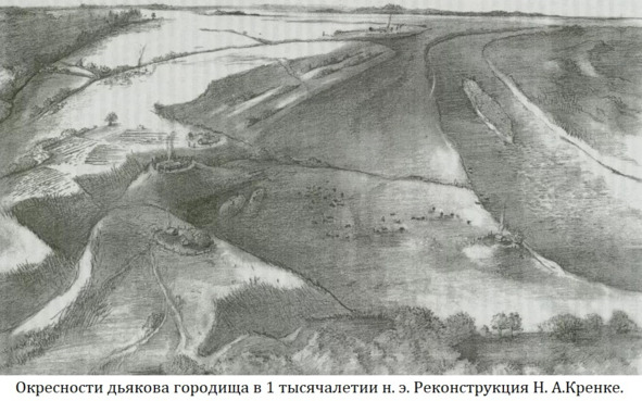 Исследования Н. А. Кренке выявили в расположении городищ на Москве-реке определенную закономерность – одинаковое расстояние, а недалеко от них (около пяти километров) располагались селища, которые образовывали с городищами единую поселенческую систему. Возле городища Дьяково располагались несколько селищ: