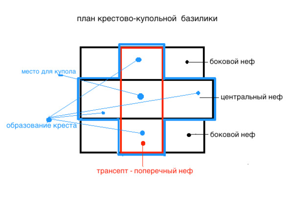 Теперь, смотрите, трансепт, пересекаясь с центральным нефом базилики, образует в плане крест, в середину, на барабан ложился купол. Таким образом, создаётся «крестово-купольная» система.