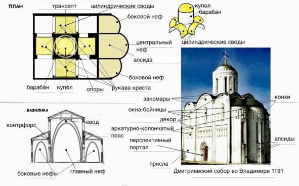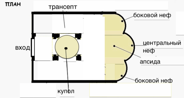 Давайте сначала разберём, что значит «крестово-купольная» система, чтобы было понятно, а потом будем искать и подсчитывать общие черты с романскими храмами рыцарской Европы. Итак «крестово-купольная» система, для начала несколько понятий: