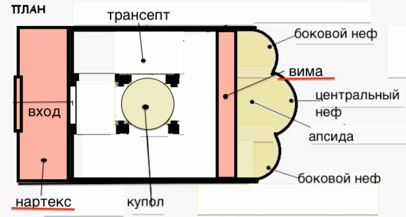 В отличии от Византийского типа – «крестово-купольной» базилики, русские храмы не имеют дополнительных отсеков – нартекса, вимы и различных притворов, давайте, посмотрим, что в итоге получается: